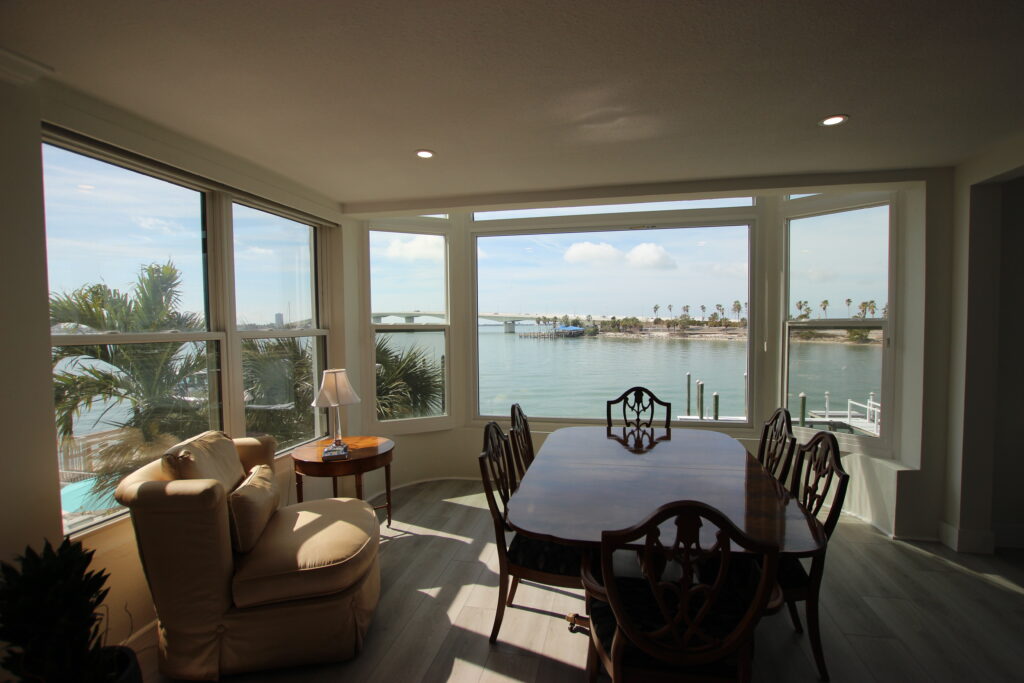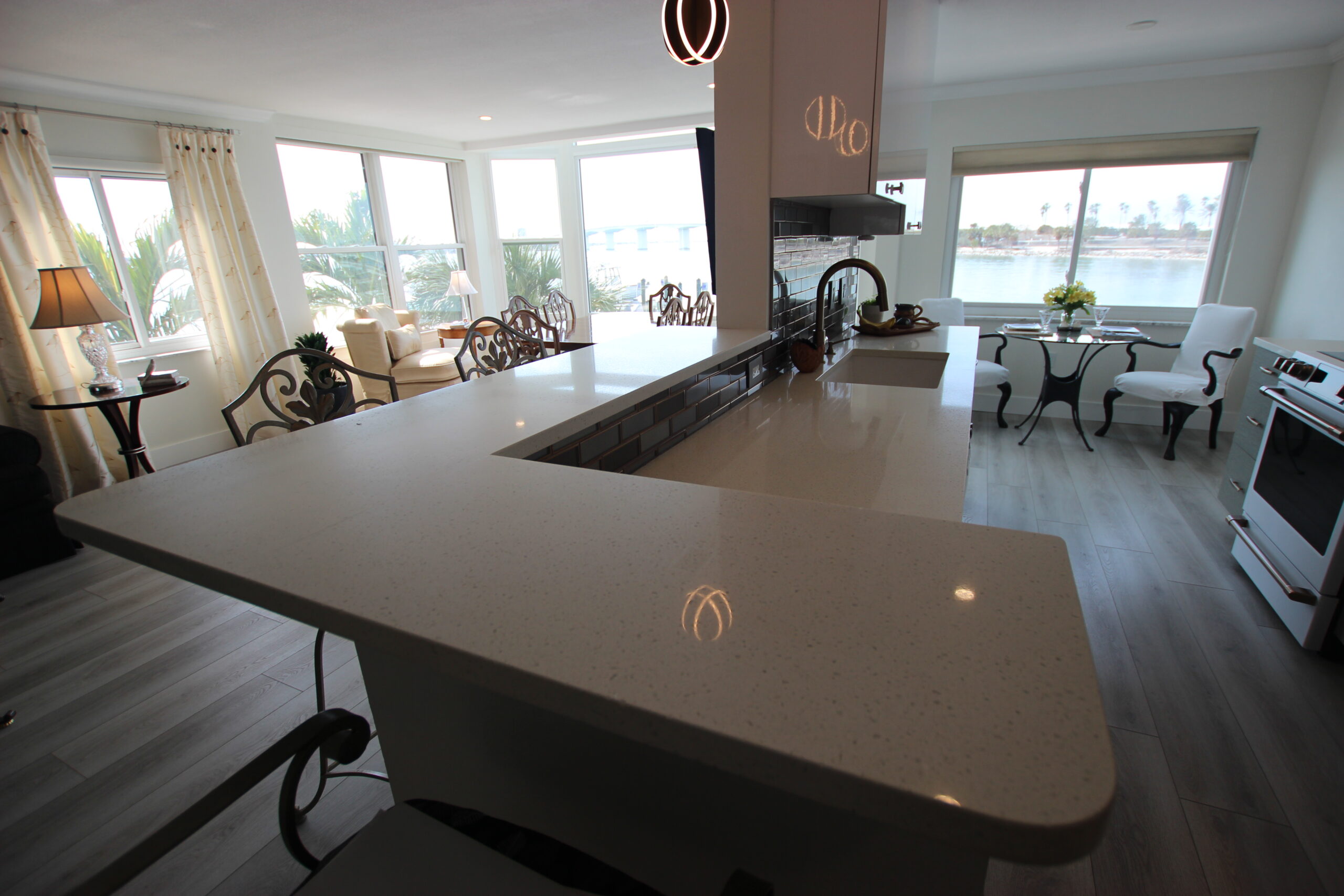 As you enter Unit 21, you are greeted by a dramatic entrance that sets the tone for the luxury that awaits. The condo showcases panoramic, unobstructed views of Sarasota Bay, offering a visual feast for residents and guests alike. The open concept design, fully renovated in 2021, features high-impact bay windows that flood the space with natural light. Gorgeous wide plank luxury vinyl tile floors flow throughout, complemented by recessed lighting, crown molding, and five-inch baseboards, ensuring an elegant and cohesive aesthetic.
